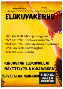 Harjavallan kirjaston aikuisten elokuvakerhon kokoontumiset keväällä 2026