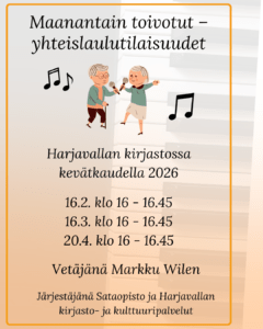 Maanantain toivotut -yhteislaulutilaisuudet jatkuvat Harjavallan kirjastossa. Vapaa pääsy, ei ilmoittautumista. Vetäjänä Markku Wilen. Tilaisuudet järjestetään 16.2., 16.3. ja 20.4. klo 16.00-16.45. Tervetuloa laulamaan!