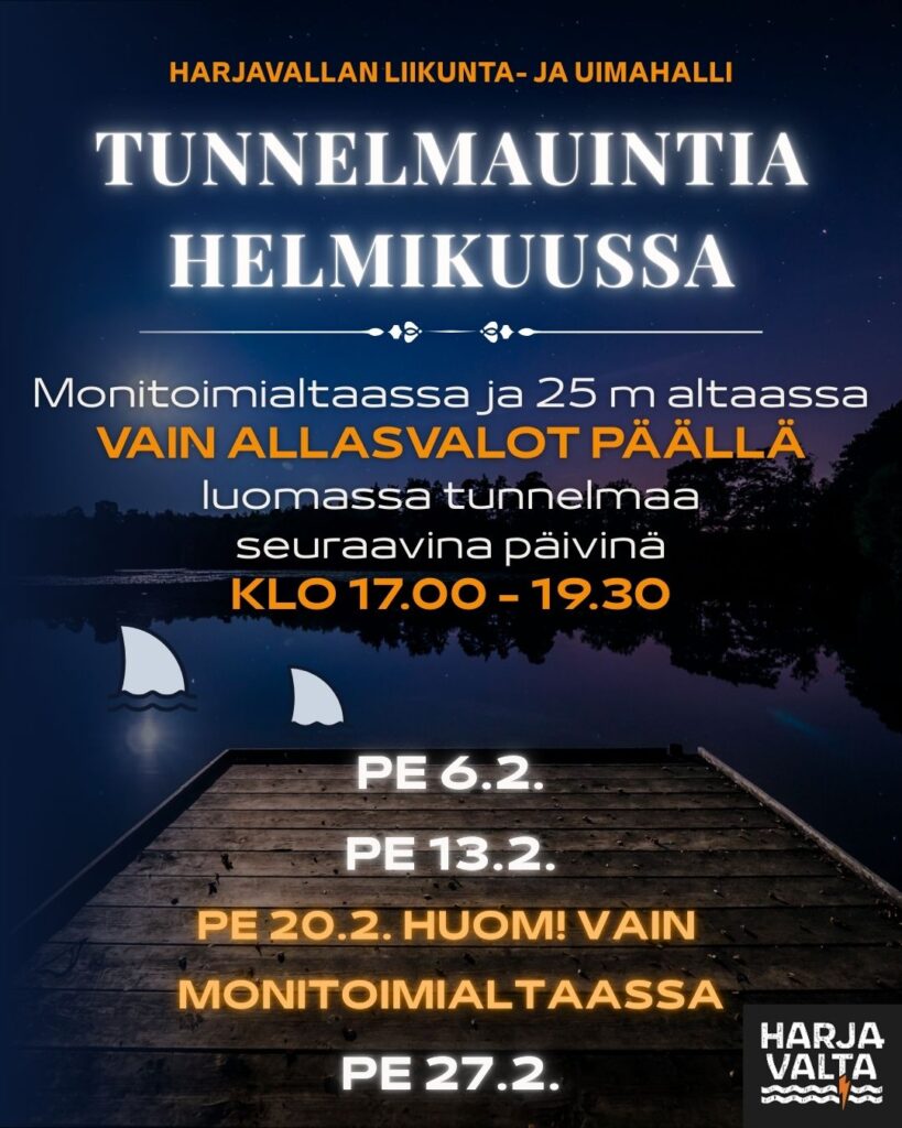 Helmikuun ajan uimahallissa on tunnelmallisempaa, sillä jatkamme joulukuulta tuttuja tunnelmauinteja! Tämä tarkoittaa, että vain allasvalot ovat päällä.Monitoimialtaassa ja 25 m altaassa vain allasvalot päällä luomassa tunnelmaa seuraavina päivinä klo 17.00 - 19.30: Pe 6.2. / 13.2. / 20.2. (vain monitoimiallas)/ Pe 27.2. Tervetuloa uimaan ja rentoutumaan tunnelmalliseen halliimme!